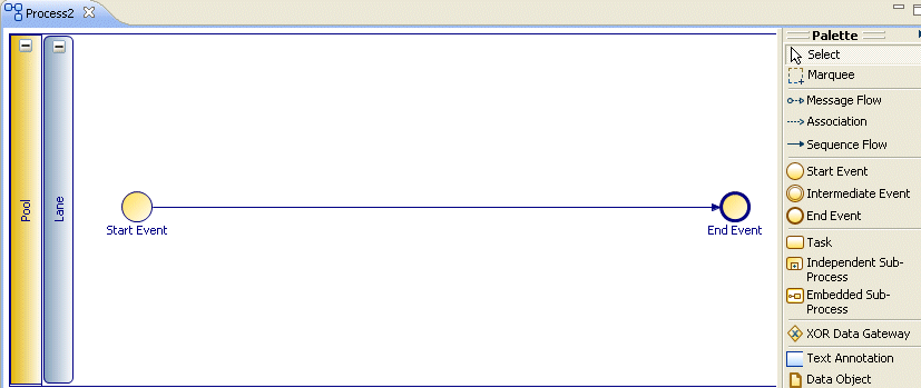 The Process Editor provides a Pool and Lane that you can rename if you plan on using pools and lanes (see Controlling Flow in a Process). You add elements of your business process using the Palette.