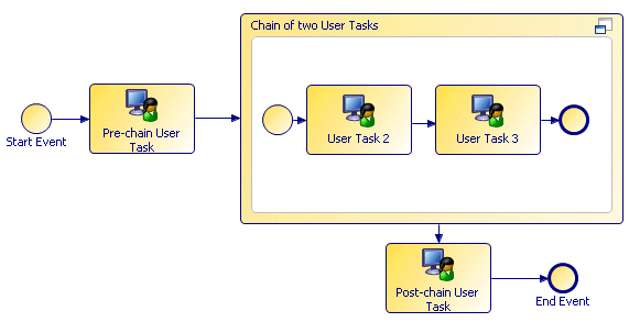 The following example shows a very simple chain of two user tasks in an embedded sub-process. Note that you can include other types of task, such as script tasks, in between the chained user tasks. However your system administrator must take into account the time likely to be taken up by these other tasks when setting the properties in the "Chaining" section of the WPProperties.properties file.
