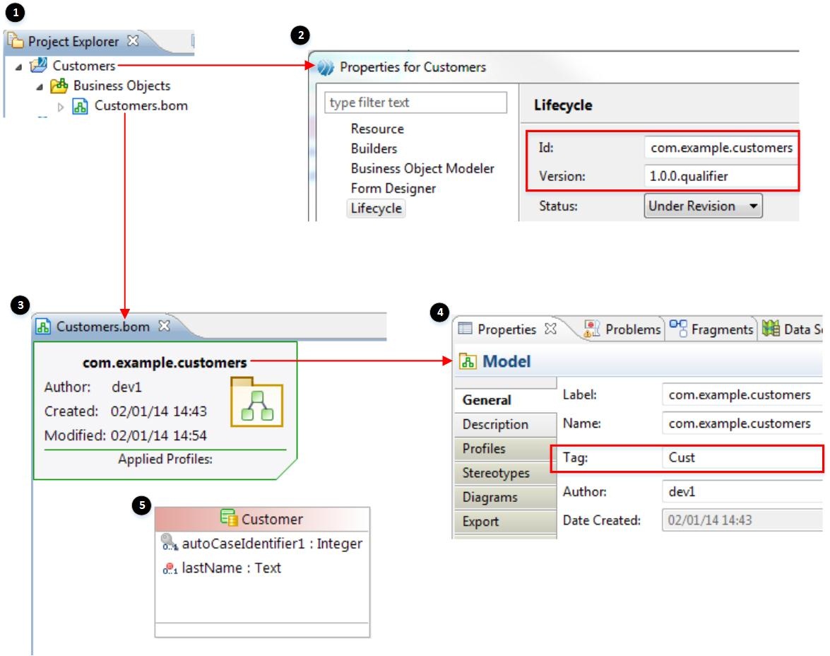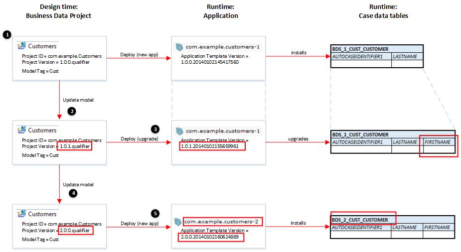 • The BPM runtime uses the major component of the project Version number (1) and the BOM Tag property value (Cust) to build the name of the case data table that represents the Customer case class.
