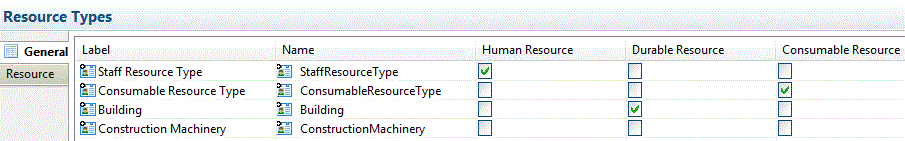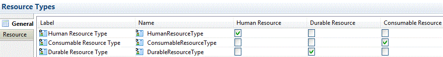 One Resource Type must always be the Human Resource, whether or not you have used the default Schema. If your Schema retains the default Schema, then in addition one resource type must have the Durable Resource property, and one the Consumable Resource property. If you select Resource Types in the Project Explorer, the General tab in the Properties View displays a matrix showing which type has which property.