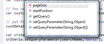 For example, in the following screenshot the content assistance shows the methods and attributes available on a criteria object.