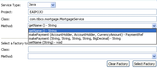 - Click Select Class. The Select Class dialog is displayed:Note: An alternative to selecting the Class is to select a factory to create the Class. To do this, click Select Factory. If a factory is available, selecting it populates the Class and Method fields (if the method is a static method with no arguments).