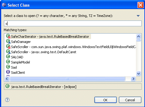 Select the appropriate class that you want to use. If you begin typing, the matching classes are displayed. In the previous example, the character s was entered, and all classes starting with s are displayed.