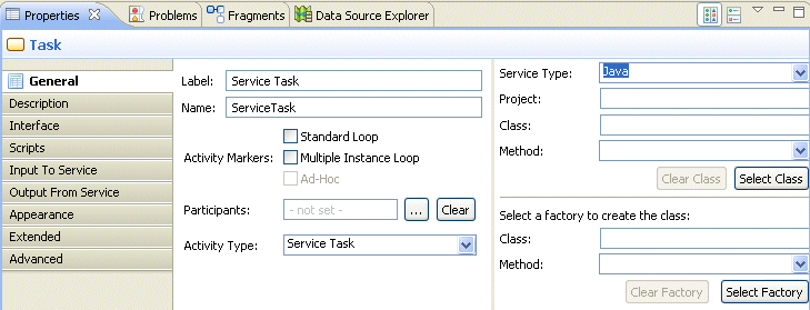- Select the Service Task, then on the General tab of the Properties view for the Service Task, select the Java option from the Service Type drop-down list: