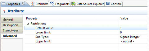 If an attribute has a default value, then as soon as an instance of the class that it is an attribute of is created, the attribute has that value. For example, if a class has an integer type attribute called quantity, it might be given a default value of 1 in the Advanced Property tab as shown below: