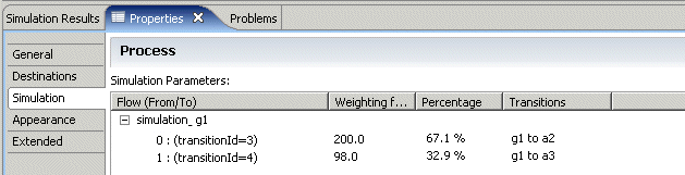 This shows that the gateway g1 has two output Sequence Flows (Id 3 and Id 4) and that one will pass 67.1% of the cases and the other 32.9%. The percentages are calculated automatically based on the weighting that you enter.