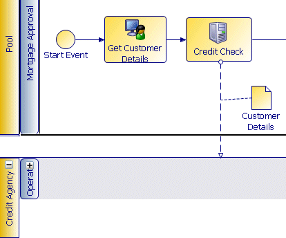 This process shows a mortgage approval process where the customer details are sent to the credit agency for approval using a message. In this case the pool and lane that represent the credit agency process are closed because we either do not care about or are not familiar with their internal processes.