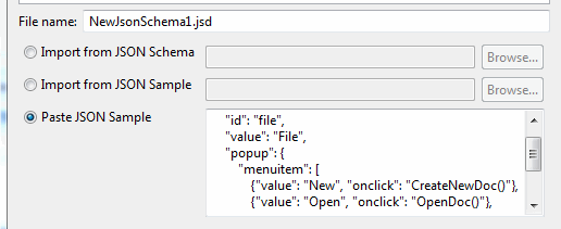 Paste from JSON Sample: this allows you to paste a sample of JSON text directly into the wizard and TIBCO Business Studio creates a schema that describes the data structure.