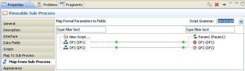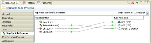 - A mapping is created between data fields and formal parameters of the sub-process and any corresponding formal parameters that are created in the subprocess. You can view this mapping by selecting the task that calls the sub-process and clicking the Map To Sub-Process and Map From Sub-Process tabs in the Properties view.