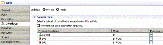 - Formal parameters in the parent process are created as formal parameters in the subprocess. They are mapped according to their mode as defined in the process API.