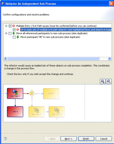 - If a data field is referenced in one or more of the tasks you select for refactoring but is also referenced elsewhere, it is automatically copied into the subprocess as a formal parameter.