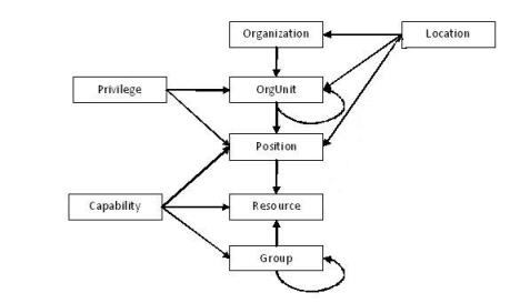 RQL expressions, starting with one of the elements listed in Organization Entities, locate resources by following the paths indicated by arrows in the diagram below. For example, an expression that specifies a capability will find all the positions, resources and groups with that capability; and then these will cascade down to find the resources in the positions and groups.