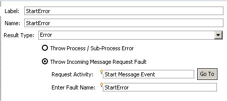 Enter Fault Name field, use content assist to select the appropriate fault message that you want to use to throw this error. (Content assist lists each fault message that is defined in the WSDL associated with the selected task or event.)