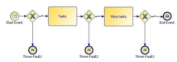 The process uses three end error events: Throw Fault1, Throw Fault2, and Throw Fault3 to throw these fault messages at appropriate points in the process logic.
