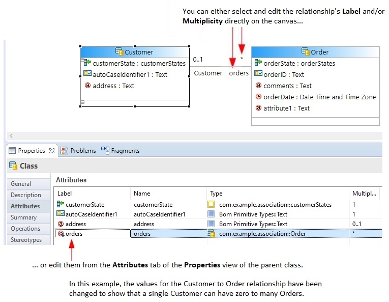 - For each end of the relationship, edit the Multiplicity Value and identifying Label/Name as needed to define the intended relationship. For example: