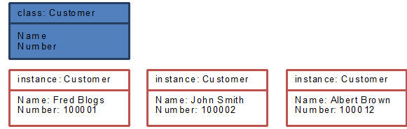 The diagram below shows a simple Customer class and three Business Objects, which are instances of the class: