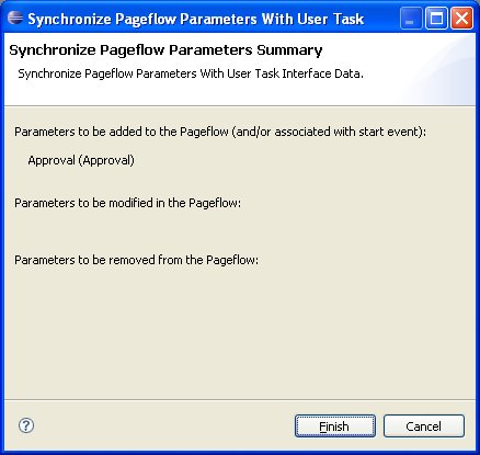 - Confirm the changes and click Finish. For example, if parameters have been added to the pageflow process but not the user task, synchronizing deletes them from the pageflow process. If parameters have been added to or removed from the user task, synchronizing adds or removes the corresponding parameters in the pageflow.
