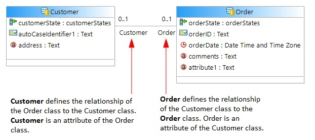 Association relationships define potential relationships between two case classes - for example, customers and orders. From within a business process, you can use these relationships to create links between case objects, and to navigate those links when searching for case objects.