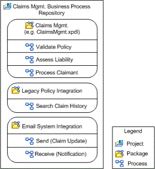 The following example shows a project and the associated packages and processes used in an insurance environment.