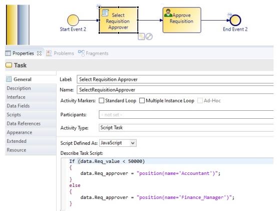 The Select Requisition Approver script task assigns a value to the Req_approver performer data field, based on the value of the requisition which is held in Req_value (and which we assume to have been defined earlier in the process).