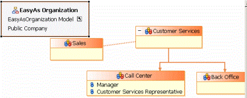 The following illustration shows a hierarchical relationship between the Customer Services Organization Unit and its sub-divisions Call Center and Back Office, and an Association between Customer Services and Sales.