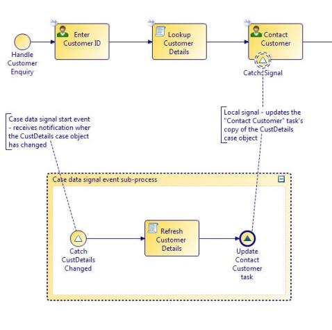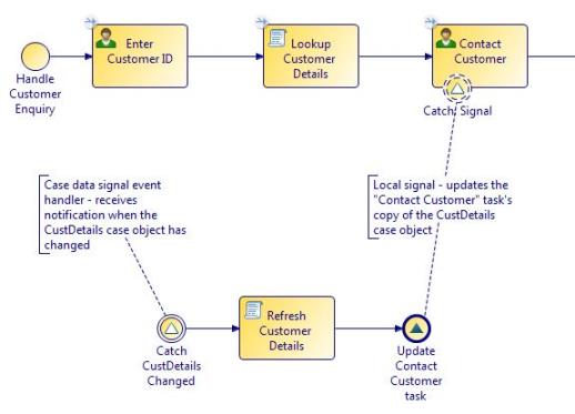 To cater for the possibility that a customer's details could change in between the time that a Contact Customer work item is scheduled and a CSR opening and completing that work item, a case data signal event handler is implemented: