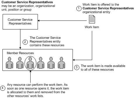 The participants assigned to a user task define the pool of users who are eligible to receive work items generated by that user task. You must also define whether a work item generated from a user task is allocated to or offered to the pool of eligible users: