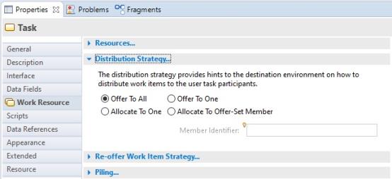 Offer To All, to offer a work item generated by this user task to all users in the pool of designated participants. This is the default option.Offer To One, to offer a work item generated by this user task to a single user in the pool of designated participants. This option is not currently supported. Do not use it. A validation error is displayed if this option is selected.Allocate To One, to allocate a work item generated by this user task to a single user in the pool of designated participants.Allocate To Offer-Set Member, to specify both an offer set for a work item, and a specific user to whom that work item should be allocated. When the work item is scheduled, if that user is not a valid member of the offer set, the work item is instead offered to the remaining members of the offer set, as if the Offer to all distribution strategy had been used instead. For more information, see Allocating a Work Item to a Member of an Offer Set.