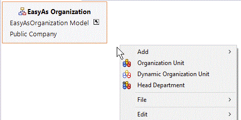An example of this is shown below. One type of Organization - the Public Company organization type - is defined in the standard Schema. One type of Organization Unit element - Head Department - is defined as a Member of that Organization Type. If your Organization is defined as a Public Company, and you right-click in the Organization Editor to add an Organization Unit, you can select either an un-Typed Organization Unit, or a Head Department unit.