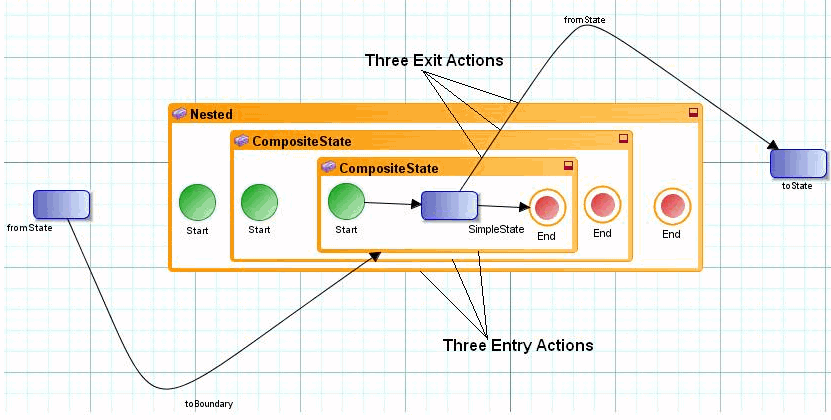Typically, transitions take an instance from one state to another state. Self transitions, however, connect a state to itself. Each time the instance loops back to the state, it triggers the entry action, and each time it leaves the state, it triggers the exit action.