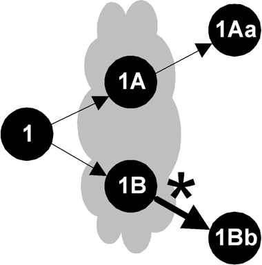 For example, suppose a state 1 times out to "All." Its possible next states are 1A and 1B. 1A transitions to 1Aa and 1B transitions to 1Bb. The state machine waits until an outgoing transition from either 1A or 1B is triggered. Suppose the outgoing transition from 1B is triggered, then the state changes to 1Bb.