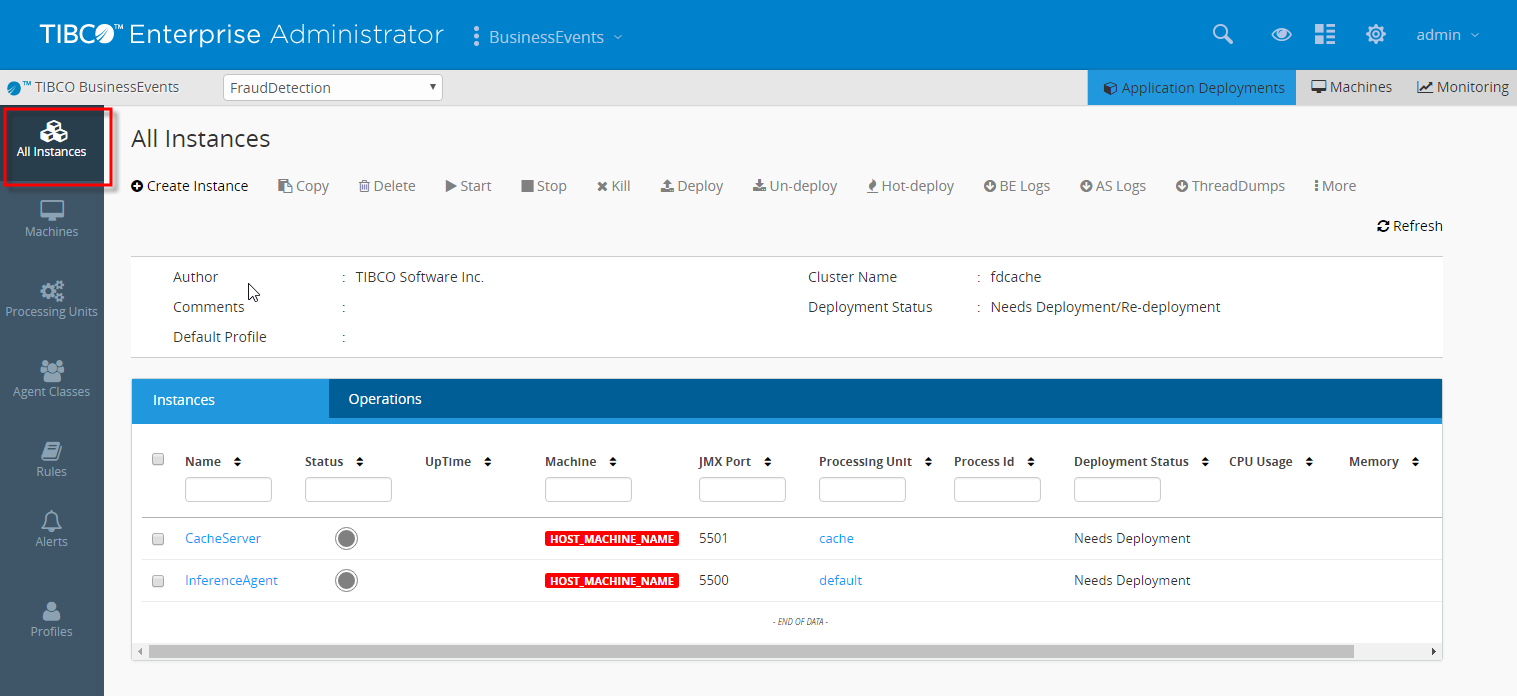 The All Instances view displays all the instance definitions of the deployment across processing units and machines.