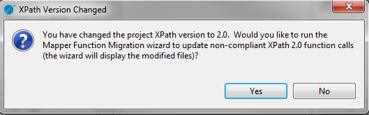 If you have changed the XPath version from 1.0 to 2.0 the XPath Version Changed confirmation dialog is displayed. Click Yes to run the Mapper Function Migration wizard to fix common mapping issues, see Migrating Mapper Functions from XPath 1.0 to XPath 2.0 for more details. Click No if you wish to fix all the mapping issues manually.