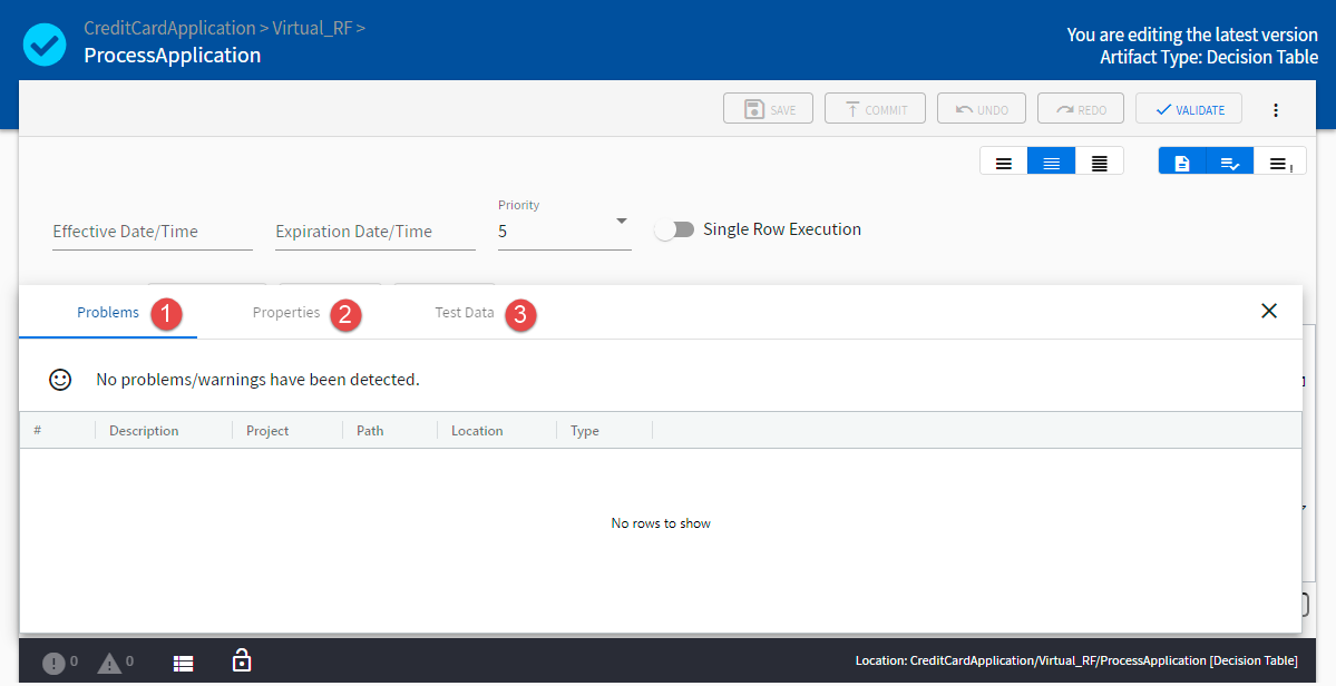 | 1 | Problems | Displays the errors and warnings after decision table validation. |