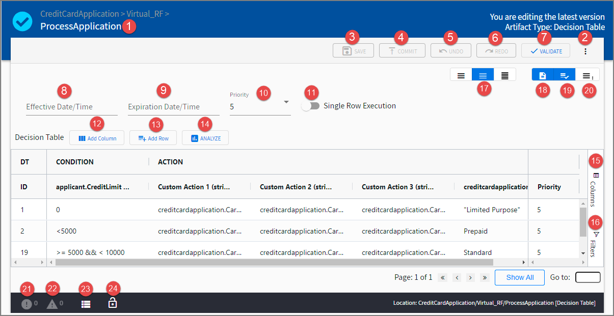 | 18 | Show table properties | Shows the table properties like Effective Date/Time, Expiration Date/Time, Priority, and Single Row Execution. For more information about these properties, see Decision Table Editor Reference. |