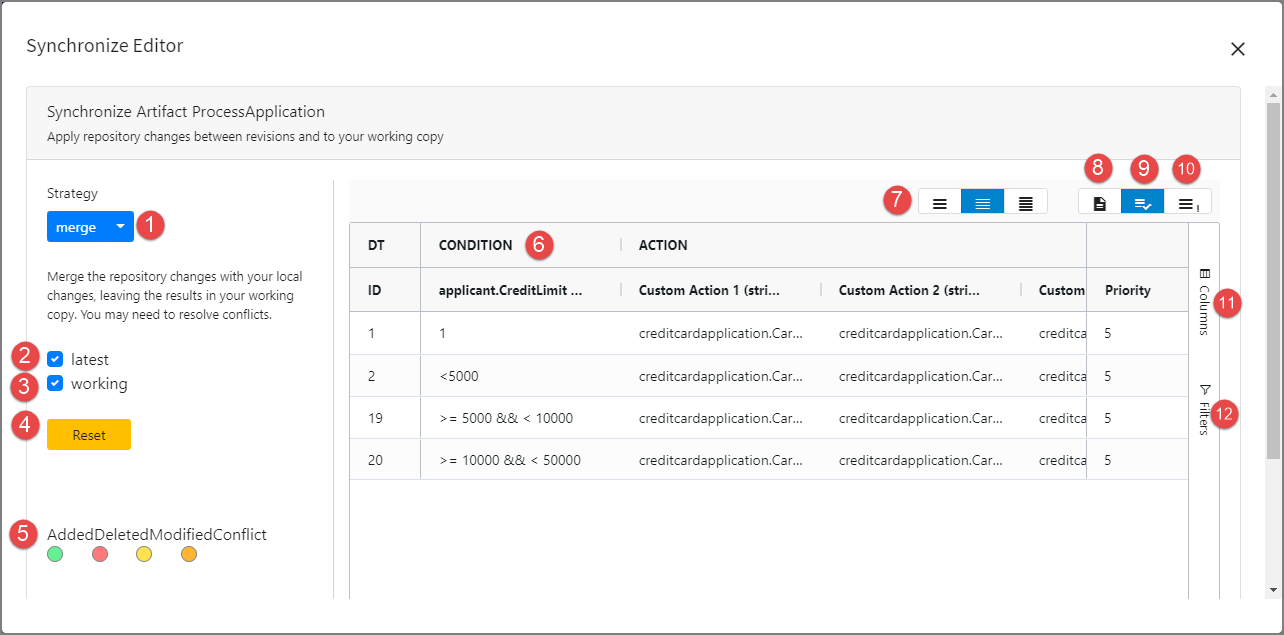 | 8 | Show table properties | Shows the table properties like Effective Date/Time, Expiration Date/Time, Priority, and Single Row Execution. For more information about these properties, see Decision Table Editor Reference. |