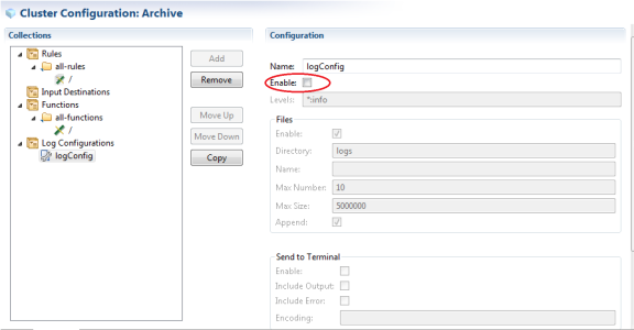 Collections tab of the project's CDD, select an existing log configuration under the Log Configurations.