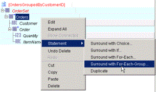 Orders. Right-click on this element and choose from the pop-up menu. This is a shortcut to create a For-Each-Group statement with theOrderselement as a child element and a Grouping statement to contain the element you wish to group-by.