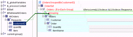 $=current-group()element in the Scope Variables area. The Grouping statement creates the list grouped by the desired element, and thecurrent-group()function allows you to access the items in theRequestsrepeating element that correspond to the group that is currently being processed. - Drag the repeating element from the Scope Variables area to the For-Each-Group statement.
