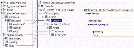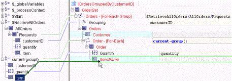 current-group()element into the desired element in the For-Each group. In this case,quantitywould map toQuantityautomatically, andItemmust be mapped toItemName.