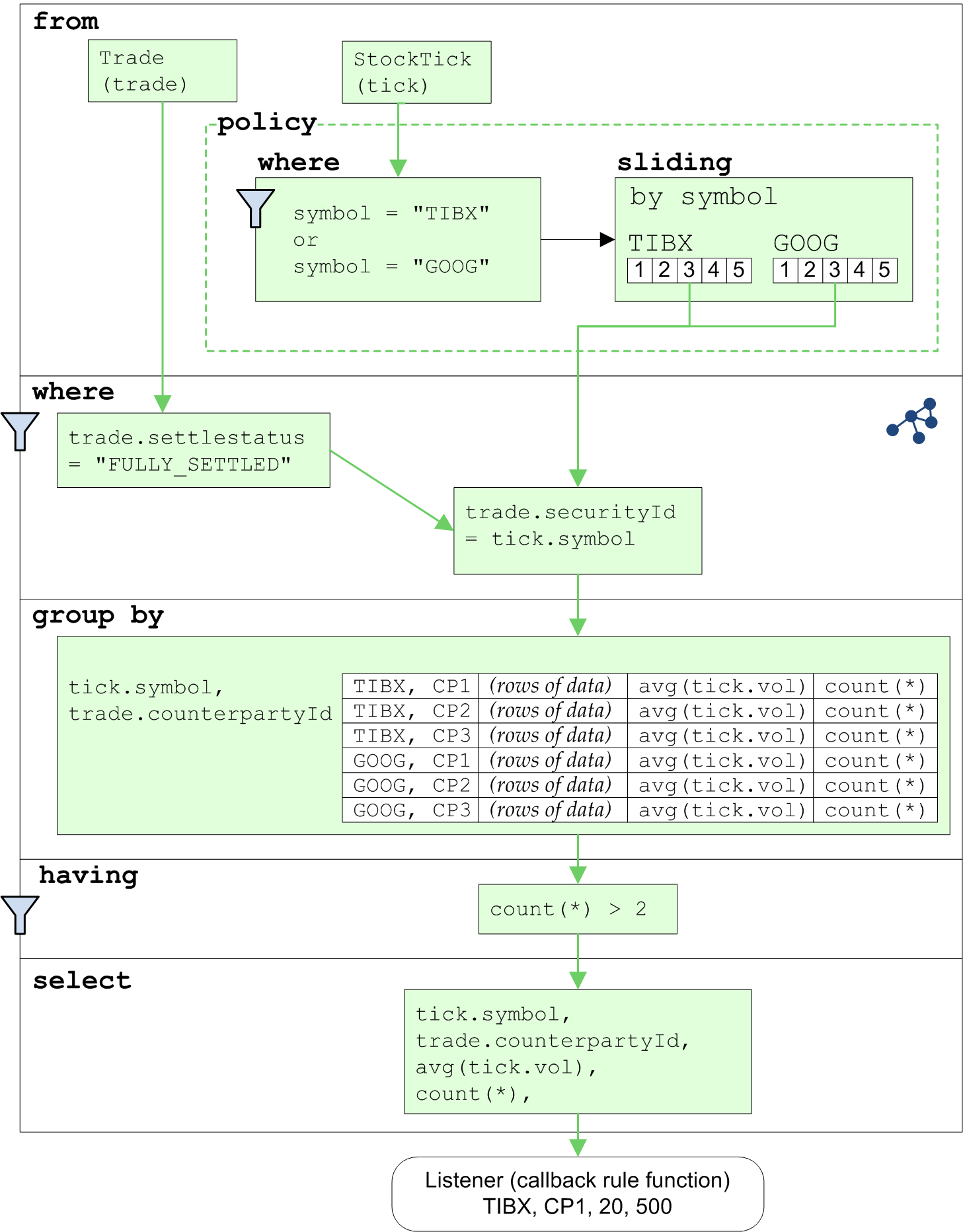 tick.symbol, trade.counterpartyId, avg(tick.volume), count(*),