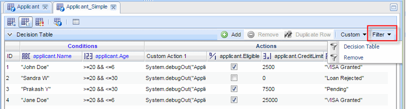 Apply filters on multiple columns for more refined results. In TIBCO BusinessEvents WebStudio decision table filter makes only textual comparison between the row values and filter values.