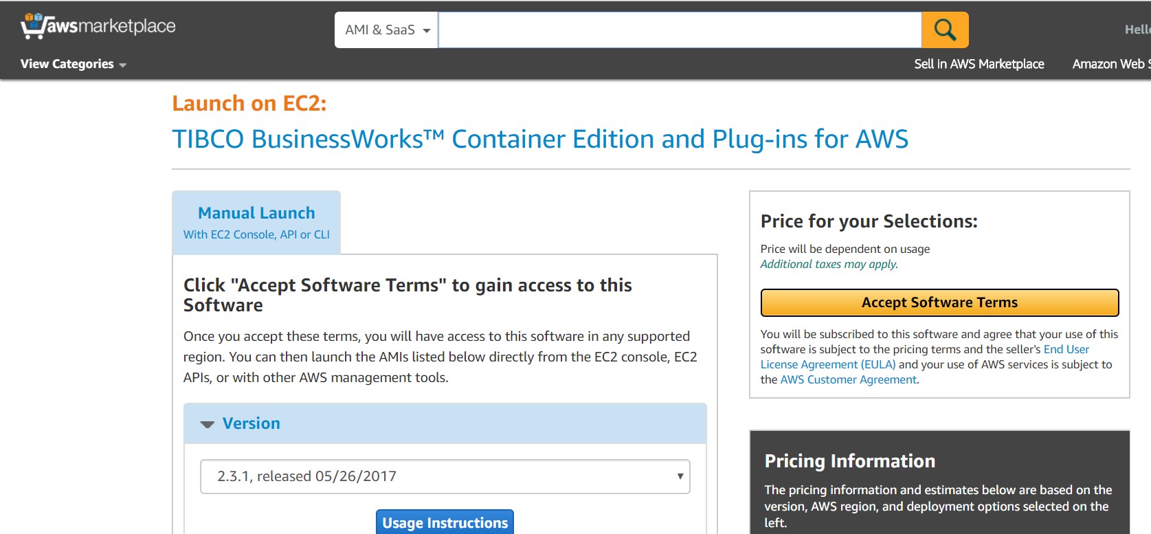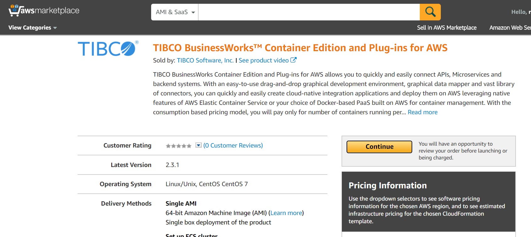 To get started, you must first access AWS marketplace and subscribe to TIBCO BusinessWorks™ Container Edition and Plug-ins for AWS Marketplace.