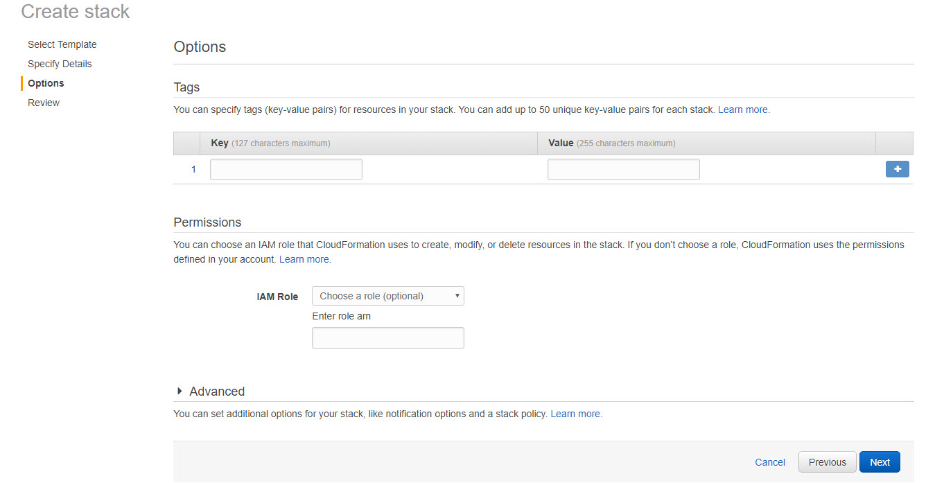 Note: A tag consists of a key or value pair that flows to resources inside your stack. You can add up to 10 unique tags for each instance.