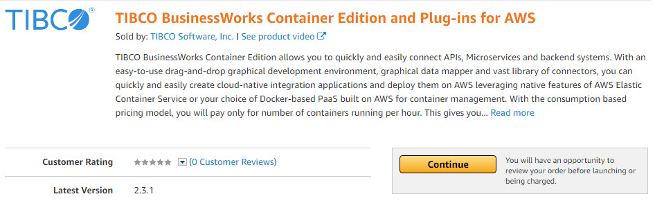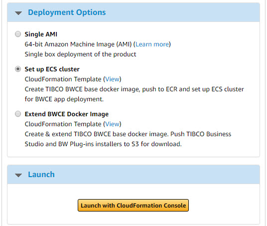 TIBCO BusinessWorks™ Container Edition and Plug-ins docker image, creates an ECR repository with name 'tibco-bwce' and pushes base docker image into the ECR repository. It then deploys a VPC, with a pair of public and private subnets spread across two availability zones. It deploys an Internet Gateway, with a default route on the public subnets. It deploys a pair of NAT Gateways (one in each AZ) and default routes for them in the private subnets. It then deploys a highly available ECS cluster of EC2 instances (ECS Hosts) launched from the TIBCO BWCE AMI in an AutoScaling Group, with the EC2 instances distributed across multiple Availability Zones. This template also provides you an option to create an Amazon S3 bucket and folder structure inside the bucket required for base docker image customization.