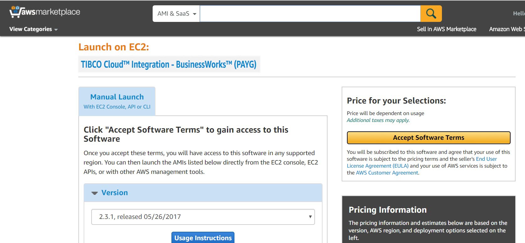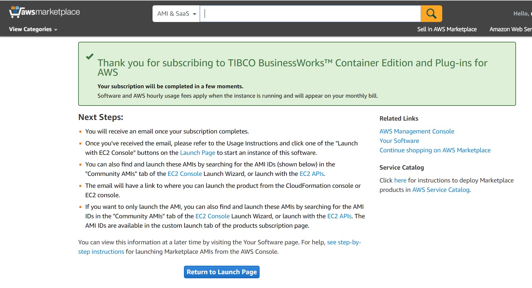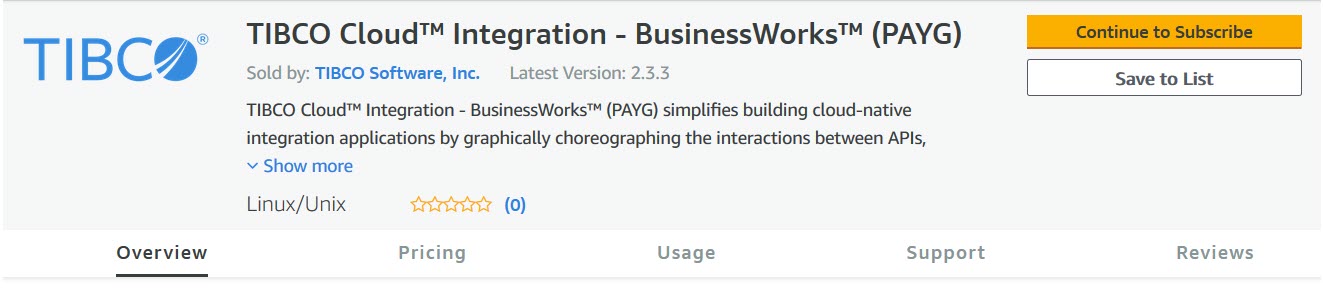 To get started, you must first access AWS marketplace and subscribe to TIBCO Cloud™ Integration - BusinessWorks™ (PAYG) or TIBCO Cloud™ Integration - BusinessWorks™ (BYOL).