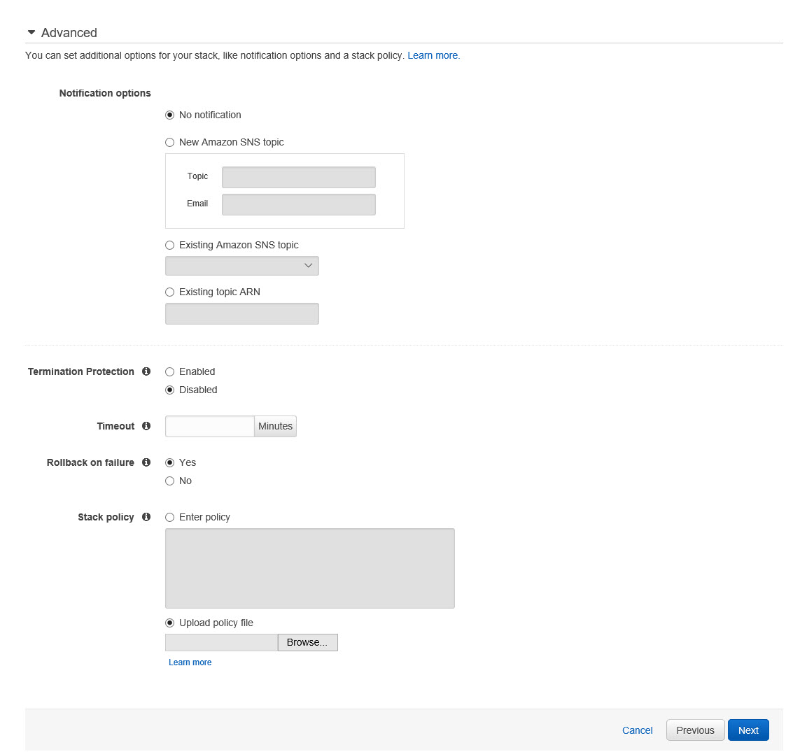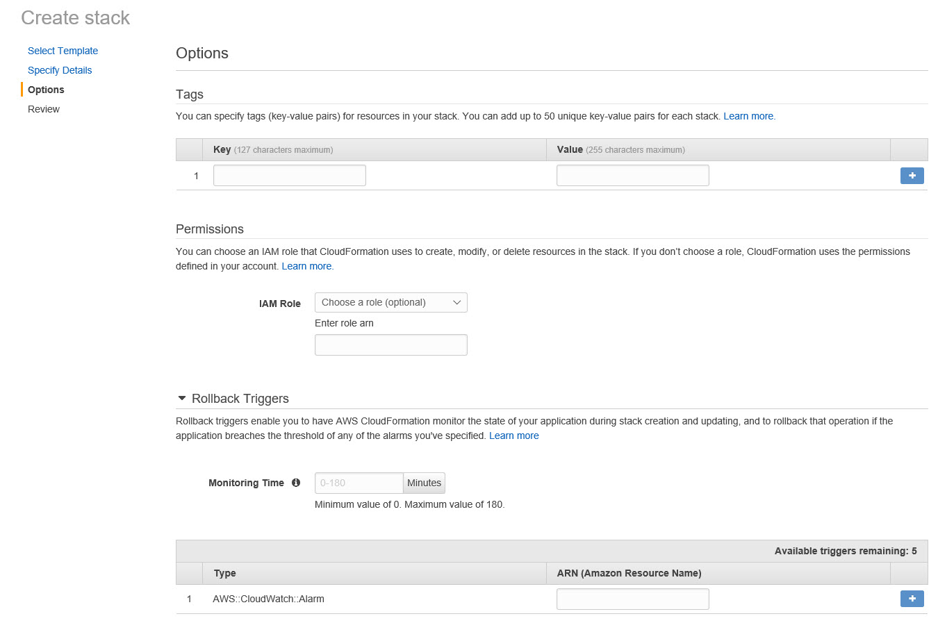 IAM Role to create, modify, or delete resources from the stack. You can also set the amount of monitoring time, during which CloudFormation monitor all rollback triggers after the stack creation or update operation deployed on all necessary resources.