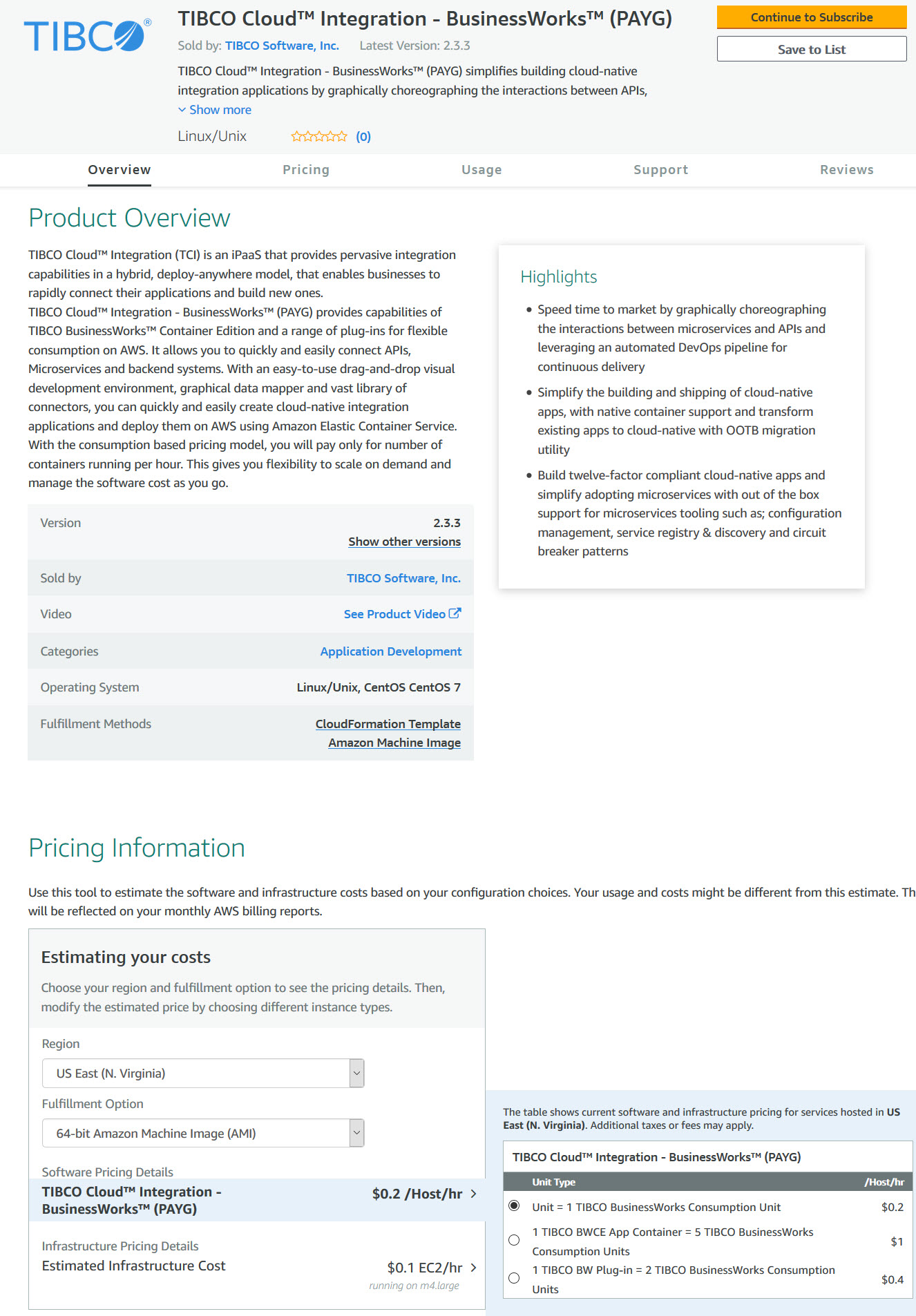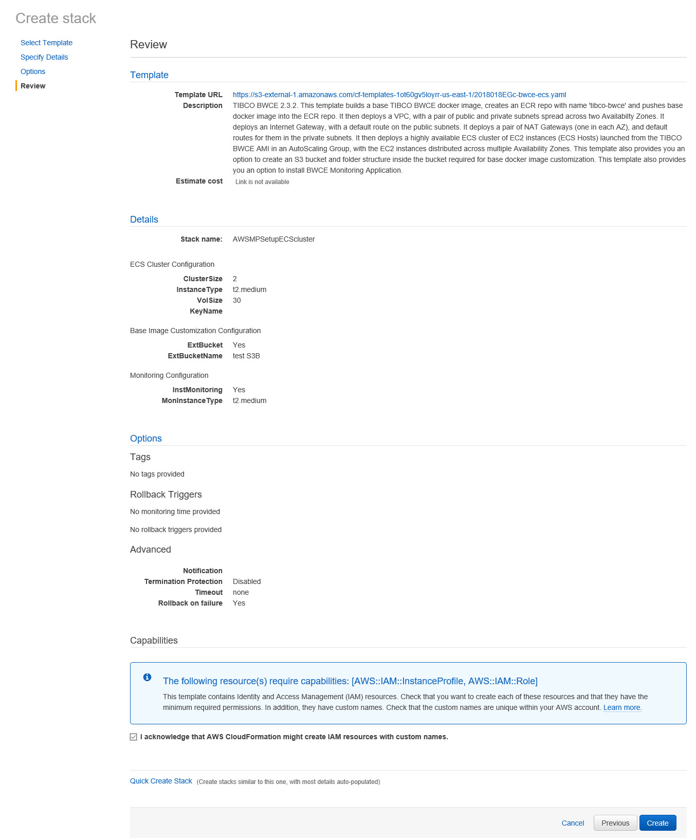 and Plug-ins docker image, creates an ECR repository with name 'tibco-bwce' and pushes base docker image into the ECR repository. It then deploys a VPC, with a pair of public and private subnets spread across two availability zones. It deploys an Internet Gateway, with a default route on the public subnets. It deploys a pair of NAT Gateways (one in each AZ) and default routes for them in the private subnets. It then deploys a highly available ECS cluster of EC2 instances (ECS Hosts) launched from the TIBCO BWCE AMI in an AutoScaling Group, with the EC2 instances distributed across multiple Availability Zones. This template also provides you an option to create an Amazon S3 bucket and folder structure inside the bucket required for base docker image customization.