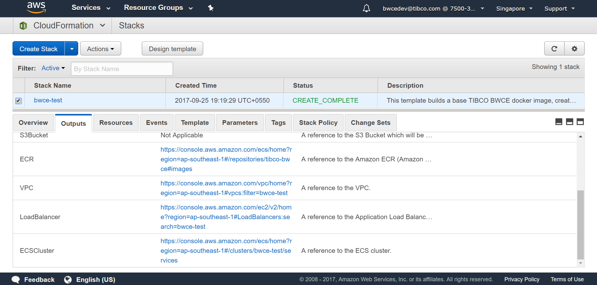 Outputs tab contains the URL for various AWS resources created as part of the Stack.