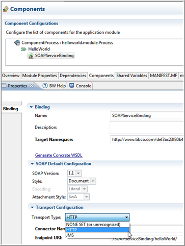 Create HttpConnResource Resource Template.The default port used by this shared resource is 8080. The service binding is now created. - To generate the concrete WSDL of the SOAP service created in the above steps, click the Generate Concrete WSDL link.